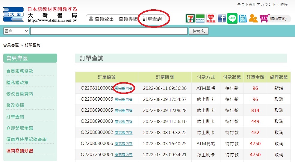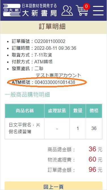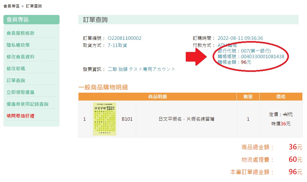 點擊該訂單後可以找到該筆訂單的轉帳帳號。