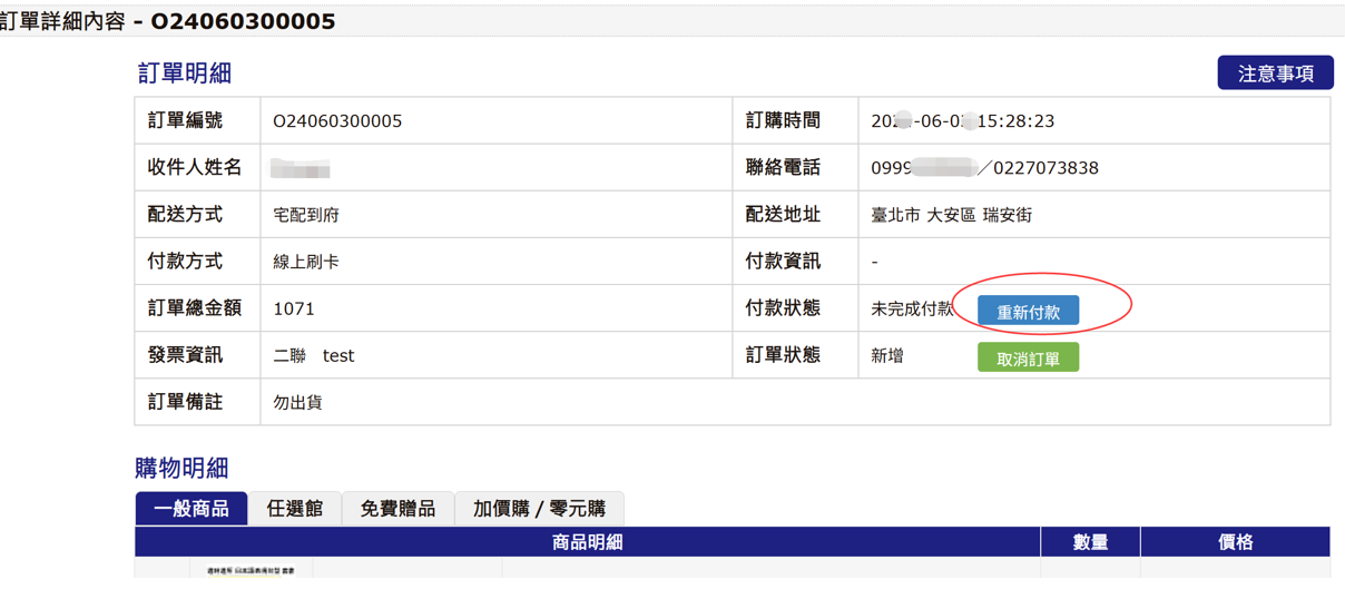● 當訂單付款失敗時,可選擇「取消訂單」或「重新付款」。