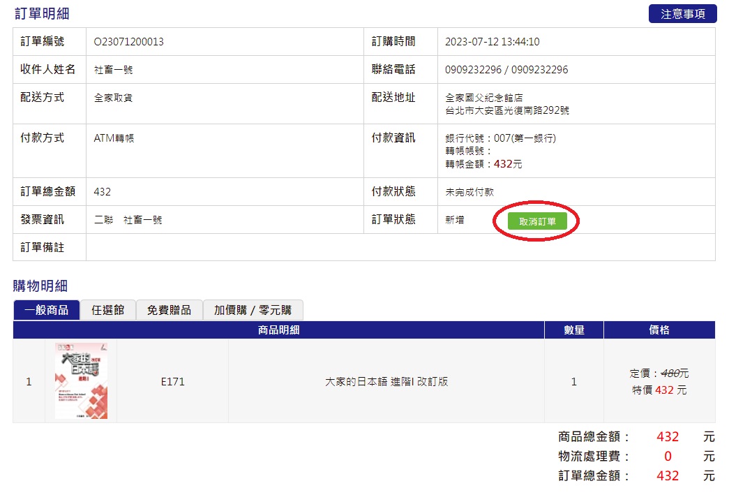 2.請確認訂單內容後,點選「訂單狀態」旁的「取消訂單」按鈕,簡單填寫取消原因即可完成取消流程。