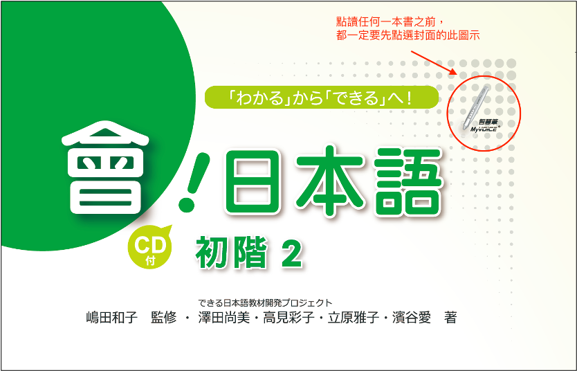 若您目前在點讀「會!日本語 初階1」,想換成「會!日本語 初階2」,需先點選「會!日本語 初階2」封面上的點讀筆圖示,才能開始聆聽該書音檔。