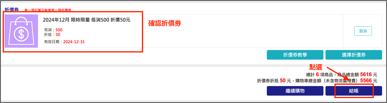 最後,確認是否有使用到折價券後,點選「結帳」,完成購買。.png)