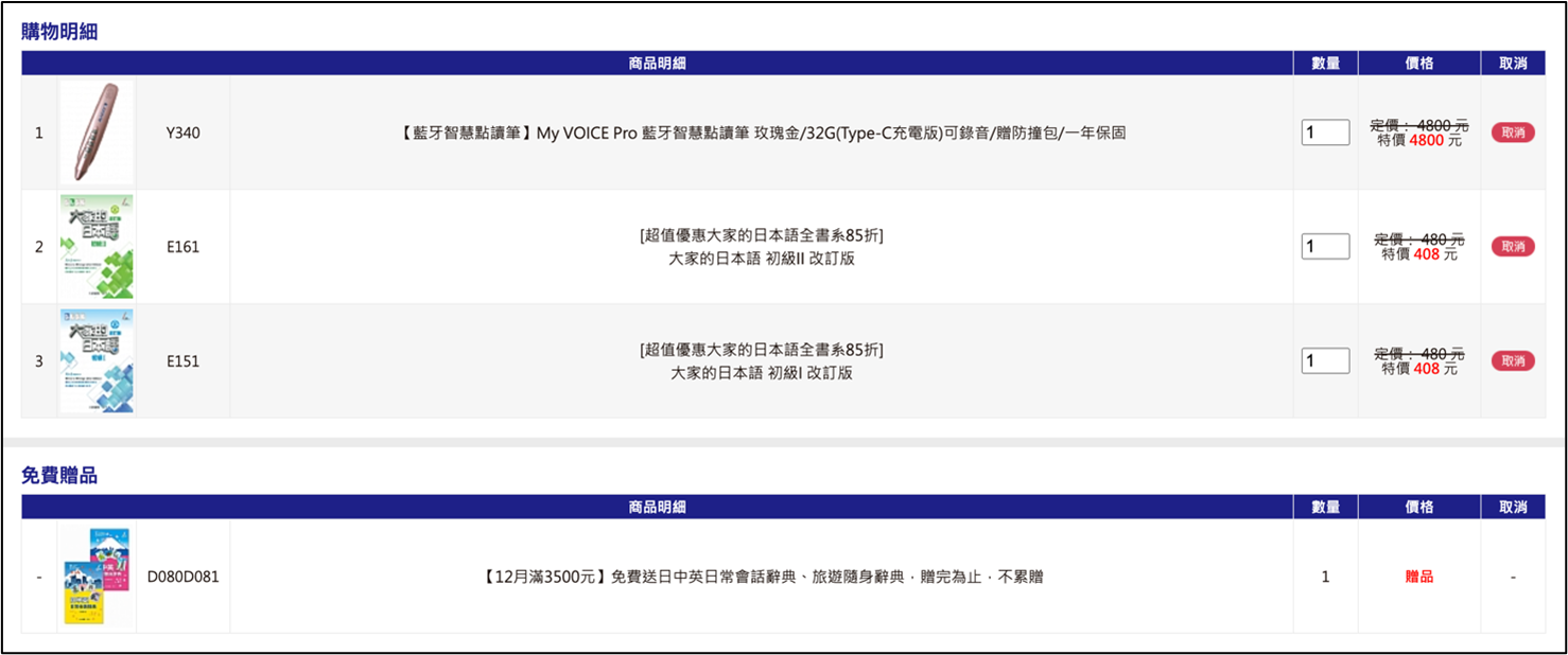 若有購買「智慧點讀筆」,結帳頁面會出現「0元購」。