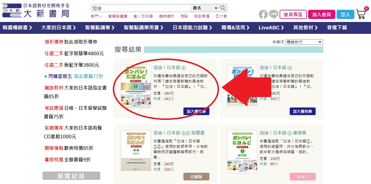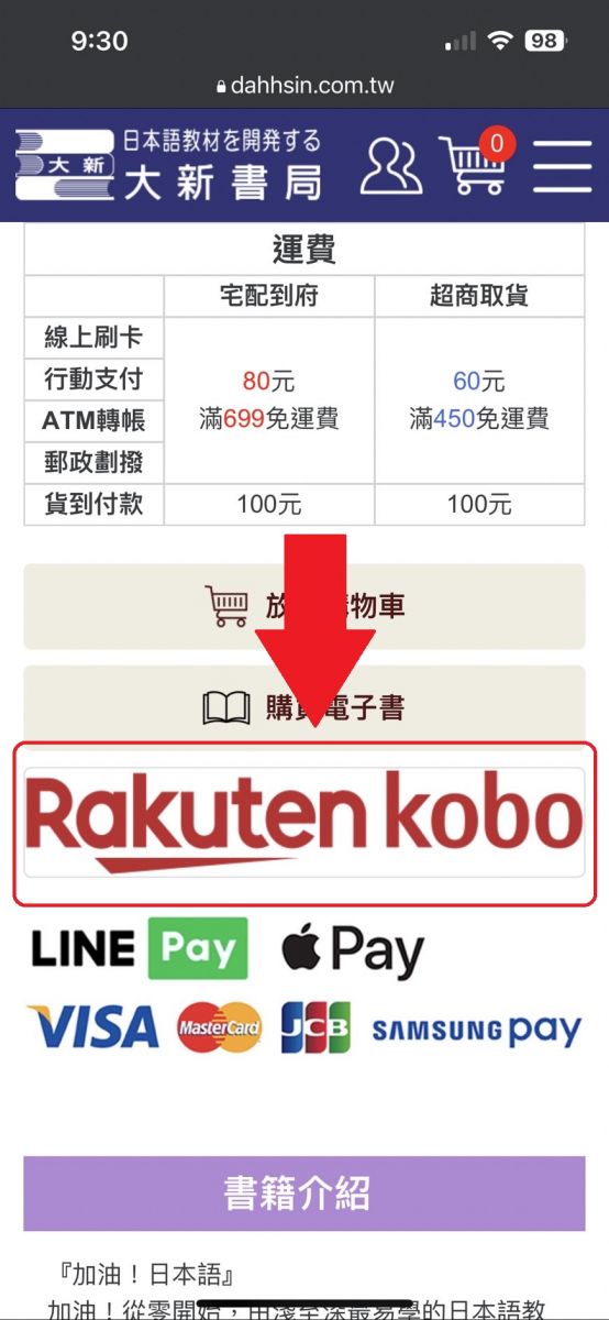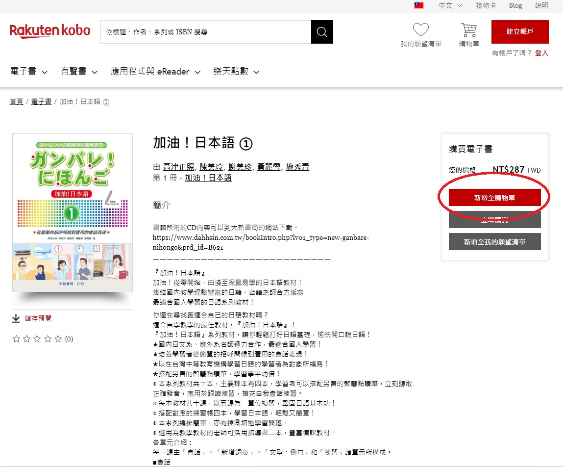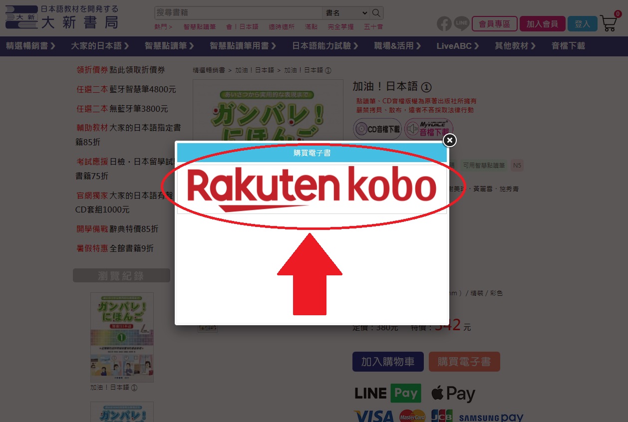 您可以從大新書局的那本書籍的介紹頁面,「加入購物車」按鈕的旁邊找到「購買電子書」的按紐。